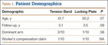 During the study period, we treated 287 olecranon fractures. Forty-nine patients met the inclusion criteria. The study population consisted of 20 patients, 10 in each cohort matched on age and length of follow-up. There were no statistically significant differences between groups in demographic variables, including dominant arm involved and number of worker’s compensation claims (Table 1). Mechanisms of injury were similar in the groups. In the tension-band group, 9 patients fell directly onto their elbow, and 1 fell onto her outstretched hand. In the locking-plate group, 8 patients fell directly onto the elbow, 1 fell onto her outstretched hand, and 1 was injured in a motorcycle accident.