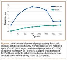 Mean (SD) BMD of the cadaveric shoulder specimens was 0.55 (0.13) g/cm2 (range, 0.29-0.68 g/cm2). The testing fixtures isolated suture slippage from anchor–bone disengagement. All 6 PushLock implants demonstrated slippage of more than 3 mm, and 5 of the 6 demonstrated slippage of more than 5 mm. All 6 ReelX devices exhibited slippage of less than 3 mm. In addition, PushLock demonstrated more suture slippage at cycles 1, 10, and 100 (P < .05) and more maximum slippage after 500 cycles (mean, 11.2 mm; SD, 4.7 mm) compared with ReelX (mean, 1.9 mm; SD, 0.5 mm) (P = .004). Figure 4 shows mean suture slippage at each cycle.