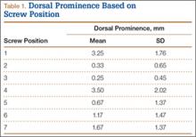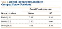 Mean (SD) dorsal prominence in millimeters is listed in Table 1. Positions 1 and 4 had significantly more dorsal prominence than the other 5 screw positions (P < .01 for all comparisons). Mean (SD) dorsal prominence based on grouped screw positions is listed in Table 2. There was significantly more dorsal prominence in the radial group that in the central group (P < .001) and ulnar group (P < .001). Mean depth of the Lister tubercle was 3.25 mm.