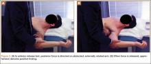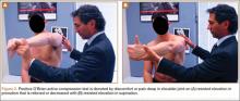 There are also many examinations for detecting labral pathology, specifically a SLAP (superior labrum, anterior to posterior) lesion, which is commonly found in patients with internal impingement. One commonly tested maneuver is the O’Brien active compression test (Figures 2A, 2B), which has excellent sensitivity and specificity in detecting type II SLAP lesions.4 In this examination, the patient holds the arm in about 15° of adduction and 90° of forward elevation. A downward force is applied with the forearm pronated and subsequently supinated. If pain is noted on the force applied to the pronated arm, and if this pain decreases in the supinated examination, the test is positive for labral pathology.