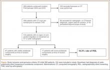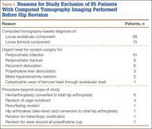 Overall, 393 patients underwent revision arthroplasty for the diagnoses (ICD-9 codes) indicated (Figure). One hundred eighty-nine patients (48.1%) had CT performed before revision. Of these 189 patients, 85 were excluded for diagnoses that were evident on either plain radiography or CT, that necessitated urgent revision, or for procedures beyond the scope of the study (Table 1). CT showed a loose cup in 28 patients; 6 of these cups were also seen on CT. Thirteen patients were diagnosed with a loose femoral stem, 10 with a periprosthetic infection, and 8 with a periprosthetic fracture.