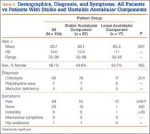 One hundred four patients (54 men, 50 women) met the study inclusion criteria. Mean age was 65.1 years. Of these 104 patients, 87 (83.7%) had a stable acetabular shell at time of revision surgery; the other 17 (16.3%) were diagnosed with RSL of the acetabular shell. Osteolysis was the most common diagnosis (89.4%) in the overall population, and pain was the most common complaint at time of presentation (66.6%). Lack of symptoms was the second most common presentation at time of revision (19.2%) (Table 2). Patients without symptoms underwent revision surgery because of concern about impending compromise of the bone–implant interface and progressive osteolysis.