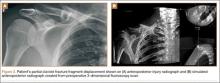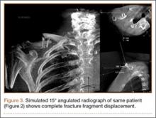 Retrospective review of our cohort’s initial radiographs revealed 1 case in which the patient’s completely displaced midshaft clavicle fracture would not have been diagnosed solely with an AP horizontal image. Cortical contact was seen on a standard AP clavicle radiograph (Figures 2A, 2B), and a 15° tilt radiograph created from 3-D fluoroscopy scan showed complete fracture fragment displacement (Figure 3). A change in fracture classification from partially displaced to fully displaced could alter the type of management used by a treating surgeon.