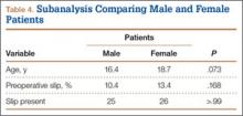 Subanalysis by sex showed no difference in age (males, 16.4 years vs females, 18.7 years; P = .073), slip percentage (10.4% vs 13.4%; P = .168), or presence or absence of slip (25 vs 26; P > .99) (Table 4).