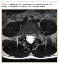 Diagnosis is crucial in early-stage lumbar spondylolysis, as osseous healing can occur with conservative treatment.11,12 High signal change (HSC) in the pedicle or pars interarticularis (Figure 1) on fluid-specific (T2) magnetic resonance imaging (MRI) sequences has been shown to be important in the diagnosis of early spondylolysis and, subsequently, a good predictor of bony healing.13,14 We conducted a study to determine the clinical and radiographic characteristics associated with the diagnosis of early or active spondylolysis.