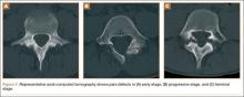 The study was reviewed and approved by the local institutional review board. Using the International Classification of Diseases, Ninth Revision (ICD-9) diagnosis code for spondylolysis (756.11), we retrospectively identified patients (age, 12-21 years) from 2002–2011 billing data from a single specialty spine practice. Baseline data—including height, weight, sex, age, symptom duration, sporting activities, defect location, pain score, and previous treatments—were collected from a standardized patient intake questionnaire and office medical records. We also determined radiographic data, including level, laterality (right vs left, unilateral vs bilateral), presence of listhesis, and slip grade and percentage. CT scans were reviewed to confirm the spondylolysis diagnosis and to measure parameters described by Fujii and colleagues.15 These parameters include spondylolysis chronicity (early, progressive, terminal) (Figure 2), distance from defect to posterior margin of vertebral body, and defect angle relative to posterior margin of vertebral body. We also measured sagittal radiographic parameters, including pelvic incidence and lumbar lordosis.