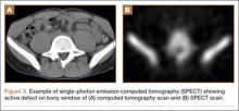 Spondylolysis, a defect in the pars interarticularis, is the single most common identifiable source of persistent low back pain in adolescent athletes.1,2 The diagnosis of spondylolysis is confirmed by radiographic imaging.3 However, there is controversy regarding which imaging modality is preferred—specifically, which to use for first-line advanced imaging after plain radiographs are obtained.3 Single-photon emission computed tomography (SPECT) consistently has been shown to be the most sensitive modality, and it is considered the gold standard.4-7 Patients with a positive SPECT scan are then routinely imaged with computed tomography (CT) for bone detail and staging of the pars defect.8 This imaging or diagnostic sequence yields organ-specific radiation doses (15-30 mSv) as much as 50-fold higher than those of plain radiography.9 Recent epidemiologic studies have shown that this organ dose results in an increased risk of cancer, especially in children.10