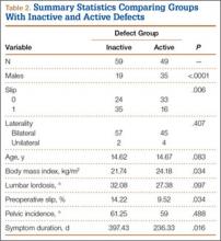 Fifty-seven patients (29 males, 28 females) with a total of 108 pars defects (6 unilateral, 102 bilateral) were identified. Mean age was 14.64 years. Of the 108 defects, 49 were classified as active and 59 as inactive. SPECT results were available for 52 defects, MRI results for 85, and CT results for 76 (Table 1). There was no difference between the active and inactive groups in age (14.7 vs 14.6 years; P = .083), body mass index (24.2 vs 21.7 kg/m2; P = .034), symptom duration (236.3 vs 397.4 days; P = .016), lumbar lordosis (27.4° vs 32.1°; P = .097), pelvic incidence (59.0° vs 61.2°; P = .488), slip percentage (9.5% vs 14.2%; P = .034), and laterality (right vs left, P = .847; unilateral vs bilateral, P = .281) (Table 2). There was a significant difference between the active and inactive groups in sex (35 vs 19 males; P < .0001) and presence of listhesis (16 vs 35; P = .006) (Table 2).