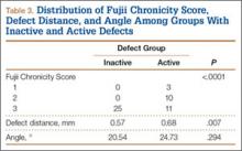 Of the 49 active defects, 3 were graded as early, 10 as progressive, and 11 as terminal (Table 3). There was a statistically significant (P < .0001) difference between active and inactive lesions for each stage. Mean distance from posterior margin of the vertebral body was 0.57 mm and 0.68 mm for inactive and active lesions, respectively (P = .007). There was no significant difference (P = .294) in the posterior angle of the vertebral body and the defect between inactive (20.54°) and active (24.73°) lesions (Table 3).