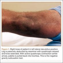 The gravity subluxation test described by Nonweiler and DeLee6 is useful in detecting MPS after lateral release and indicates that the vastus lateralis muscle has been detached from the patella and that the lateral retinaculum is lax. In this test, the patient is positioned in the lateral decubitus position with the involved knee farthest from the table. In this position, gravity causes the patella to subluxate out of the trochlea. The test is positive for MPS when a voluntary contraction of the quadriceps does not center the patella into the trochlear groove. Patients with MPS without previous lateral release can have the patella subluxate medially in the lateral decubitus position, but it is pulled back into the trochlea with active quadriceps contraction (Figure 1).