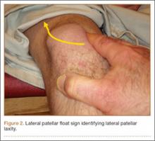 Patients with MPS often have lateral patellar laxity (LPL), which allows the patella to rotate upward on the lateral side and skid across the medial facet of the femoral trochlea. A physical examination sign combining lateral patellar glide and tilt was described by Shneider24 to identify LPL. This “lateral patellar float” sign is present when the patella translates laterally and rotates or tilts upward with medial pressure on the patella (Figure 2). Another maneuver to test for subtle MPS involves manually centering the patella in the trochlea during active knee flexion and extension. The involved knee is examined in the seated position. The examiner attempts to center the patella in the trochlea with a laterally directed force from the examiner’s thumb on the medial border of the patella. This will usually provide immediate relief as the patient actively ranges the knee.