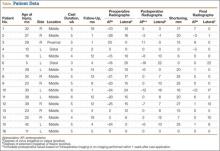 Our experience with this technique in 16 unilateral femur fractures has been favorable (Table). Patient age ranged from 5 months to 3 years. Mean pretreatment angulation was 13° varus and 11° procurvatum. The majority of fractures were femoral shaft fractures; 1 was proximal, 2 distal.