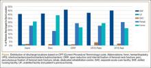 Surgery type significantly affected discharge to rehabilitation (Figure). Patients who were undergoing open plating of a femoral neck fracture or intramedullary nailing of an intertrochanteric, peritrochanteric, or subtrochanteric femoral fracture constituted 30% of all patients discharged to rehabilitation centers. In contrast, patients undergoing percutaneous skeletal fixation of a proximal femoral fracture constituted only 5.5% of all patients discharged to rehabilitation. Based on surgery type, we broke down discharge location further, into categories of skilled nursing facility, unskilled facility (not patient’s previous home), separate acute-care facility, dedicated rehabilitation center, and home. Of all 4815 patients combined, 2102 (43.6%) were discharged to a skilled nursing facility, 31 (0.6%) to an unskilled facility (not home), 106 (2.2%) to separate acute care, 1312 (27.2%) to a dedicated rehabilitation center, and 950 (19.7%) home.