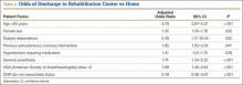 Applying these adjusted odds ratios, we see that an elderly woman (age, >65 years) who underwent general anesthesia with an ASA class higher than 2 was 17.63 times more likely than a patient without these risk factors to be discharged to rehabilitation. If this patient were also dialysis-dependent, she would be 61.52 times more likely than a similar patient without dialysis needs to be discharged to rehabilitation.