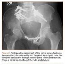 Gorham-Stout disease is an exceedingly rare condition resulting in spontaneous osteolysis. Approximately 200 cases have been reported with no apparent gender, race, or familial predilection or systemic symptoms differentiating it from other etiologies of idiopathic osteolysis.6 These patients often seek medical attention after sustaining a pathologic fracture,6 when a broad differential diagnosis narrows to GSD only after biopsy excludes other possibilities and demonstrates characteristic angiomatosis without malignant features.2,4,6,8,10 Gorham-Stout disease appears more frequently at particular sites within the skeleton, and pelvic involvement is common—more than 20% of cases in 1 review.5,10 Limitations in the patient’s ability to ambulate invariably result from osteolysis of the pelvis, which is concerning considering the young age at which GSD typically presents. A variety of treatment modalities have been described for pelvic GSD, but surgery has been undertaken in relatively few cases.5