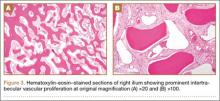 Thirty-seven months after his initial presentation, he underwent posterior spinal fusion L5 to S1, SI fusion, and anterior locking plate fixation of the pubic symphysis, as seen in Figure 2. Pathology from surgical specimens, seen at original magnification ×20 and ×100 in Figures 3A and 3B, respectively, showed prominent vascular proliferation in the right ilium, with reactive bone changes in the left ilium and right sacrum. A lytic lesion showed fibrous tissue with an embedded fragment of necrotic bone.