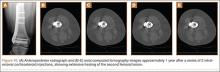 At 6-week follow-up after the intralesional steroid injection, the patient’s pain continued to abate, and she was ambulating with crutches. Repeat CT scan of the right distal femur showed improvement of the extraosseous soft-tissue component, while the lucency in the femur itself remained unchanged. The decision was made to proceed with a second intralesional corticosteroid injection under CT guidance. The patient’s symptoms continued to improve, and repeat imaging 1 year after her steroid injections showed substantial bony healing with reconstitution of her cortical bone (Figures 10A-10E).