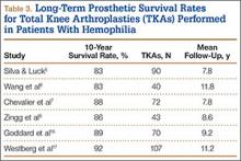 The prosthetic survival rate found in this study compares well with other reported rates for patients with hemophilia and other bleeding disorders. However, evidence regarding long-term prosthesis survival in TKAs performed for patients with hemophilia is limited. Table 3 summarizes the main reported series of patients with hemophilia with 10-year prosthetic survival rates, number of TKAs performed, and mean follow-up period; in all these series, implant removal for any reason was regarded as the final endpoint.5-8,16,17 Mean follow-up in our study was 8 years. Clinical outcomes of TKA in patients with severe hemophilia and related disorders are expected to be inferior to those achieved in patients without a bleeding condition. The overall 10-year prosthetic survival rate for cemented TKA implants, as reported by the Norwegian Arthroplasty Register, was on the order of 93%.18 Mean age of our patients at time of surgery was only 38.2 years. TKAs performed in younger patients without a bleeding disorder have been associated with shorter implant survival times relative to those of elderly patients.19 Thus, Diduch and colleagues20 reported a prosthetic survival rate of 87% at 18 years in 108 TKAs performed on patients under age 55 years. Lonner and colleagues21 reported a better implant survival rate (90% at 8 years) in a series of patients under age 40 years (32 TKAs). In a study by Duffy and colleagues,22 the implant survival rate was 85% at 15 years in patients under age 55 years (74 TKAs). The results from our retrospective case assessment are quite similar to the overall prosthetic survival rates reported for TKAs performed on patients without hemophilia.