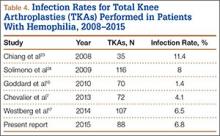 Rates of periprosthetic infection after primary TKA in patients with hemophilia and other bleeding conditions are much higher (up to 11%), with a mean infection rate of 6.2% (range, 1% to 11%), consistent with the rate found in our series of patients (6.8%)7,16,17,23,24 (Table 4). This rate is much higher than that reported after primary TKA in patients without hemophilia but is similar to some rates reported for patients with hemophilia. In our experience, most periprosthetic infections (5/6) were sorted as late.