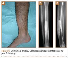 At the last follow-up 15 years after surgery, the anterior tibial bowing was not changed (Figure 6A), but the patient additionally complained of skin irritation after intense training wearing boots during military service. The radiographic appearance of the lesion was also not changed, while the periphery of the lesion exhibited scarce radiating bony streaks with rounded contours (Figures 6B, 6C). The clinical symptoms and signs from wearing military boots completely subsided after a couple of weeks’ rest from daily army activities, but the mild spontaneous pain and the local tenderness over the tibial bowing persisted.