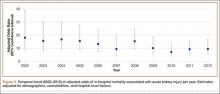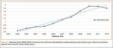 We identified 7,235,251 patients who underwent elective hip or knee arthroplasty for osteoarthritis between 2002 and 2012—an estimate consistent with data from the Centers for Disease Control and Prevention.22 Of that total, 94,367 (1.3%) had AKI. The proportion of discharges diagnosed with AKI increased rapidly over the decade, from 0.5% in 2002 to 1.8% to 1.9% in the period 2010–2012. This upward trend was highly significant (Ptrend < .001) (Figure 1). Patients with AKI (vs patients without AKI) were more likely to be older (mean age, 70 vs 66 years; P < .001), male (50.8% vs 38.4%; P < .001), and black (10.07% vs 5.15%; P<. 001). They were also found to have a significantly higher comorbidity score (mean CCI, 2.8 vs 1.5; P < .001) and higher proportions of comorbidities, including hypertension, CKD, atrial fibrillation, diabetes mellitus (DM), congestive heart failure, chronic liver disease, and hepatitis C virus infection. In addition, AKI was associated with perioperative myocardial infarction (MI), sepsis, cardiac catheterization, and blood transfusion. Regarding socioeconomic characteristics, patients with AKI were more likely to have Medicare/Medicaid insurance (72.26% vs 58.06%; P < .001) and to belong to the extremes of income categories (Table 2).