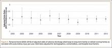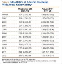 We then analyzed the impact of AKI on hospital outcomes, including in-hospital mortality, discharge disposition, LOS, and cost of care. Mortality was significantly higher in patients with AKI than in patients without it (2.08% vs 0.06%; P < .001). Even after adjusting for confounders (eg, demographics, comorbidity burden, perioperative sepsis, hospital-level characteristics), AKI was still associated with strikingly higher odds of in-hospital death (adjusted OR, 11.32; 95% CI, 9.34-13.74; P < .001). However, analysis of temporal trends indicated that the odds for adjusted mortality associated with AKI decreased from 18.09 to 9.45 (Ptrend = .01) over the period 2002–2012 (Figure 3). This decrease in odds of death was countered by an increase in incidence of AKI, resulting in a stable attributable risk proportion (97.9% in 2002 to 97.3% in 2012; Ptrend = .90) (Table 4). Regarding discharge disposition, patients with AKI were much less likely to be discharged home (41.35% vs 62.59%; P < .001) and more likely to be discharged to long-term care (56.37% vs 37.03%; P< .001). After adjustment for confounders, AKI was associated with significantly increased odds of adverse discharge (adjusted OR, 2.24; 95% CI, 2.12-2.36; P< .001). Analysis of temporal trends revealed no appreciable decrease in the adjusted odds of adverse discharge between 2002 (adjusted OR, 1.87; 95% CI, 1.37-2.55; P < .001) and 2012 (adjusted OR, 1.93; 95% CI, 1.76-2.11; P < .001) (Figure 4, Table 5). Last, both mean LOS (5 days vs 3 days; P < .001) and mean cost of hospitalization (US $22,269 vs $15,757; P < .001) were significantly higher in patients with AKI.