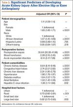 Using multivariable logistic regression, we found that increased age (1.11 increase in adjusted OR for every year older; 95% CI, 1.09-1.14; P < .001), male sex (adjusted OR, 1.65; 95% CI, 1.60-1.71; P < .001), and black race (adjusted OR, 1.57; 95% CI, 1.45-1.69; P < .001) were significantly associated with postoperative AKI. Regarding comorbidities, baseline CKD (adjusted OR, 8.64; 95% CI, 8.14-9.18; P < .001) and congestive heart failure (adjusted OR, 2.74; 95% CI, 2.57-2.92; P< .0001) were most significantly associated with AKI. Perioperative events, including sepsis (adjusted OR, 35.64; 95% CI, 30.28-41.96; P < .0001), MI (adjusted OR, 6.14; 95% CI, 5.17-7.28; P < .0001), and blood transfusion (adjusted OR, 2.28; 95% CI, 2.15-2.42; P < .0001), were also strongly associated with postoperative AKI. Last, compared with urban hospitals and small hospital bed size, rural hospitals (adjusted OR, 0.70; 95% CI, 0.60-0.81; P< .001) and large bed size (adjusted OR, 0.82; 95% CI, 0.70-0.93; P = .003) were associated with lower probability of developing AKI (Table 3).