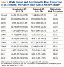 We compared the baseline characteristics of hospitalized patients with and without AKI. To test for significance, we used the χ2 test for categorical variables, the Student t test for normally distributed continuous variables, the Wilcoxon rank sum test for non-normally distributed continuous variables, and the Cochran-Armitage test for trends in AKI incidence. We used survey logistic regression models to calculate adjusted odds ratios (ORs) with 95% confidence intervals (95% CIs) in order to estimate the predictors of AKI and the impact of AKI on hospital outcomes. We constructed final models after adjusting for confounders, testing for potential interactions, and ensuring no multicolinearity between covariates. Last, we computed the risk proportion of death attributable to AKI, indicating the proportion of deaths that could potentially be avoided if AKI and its complications were abrogated.21