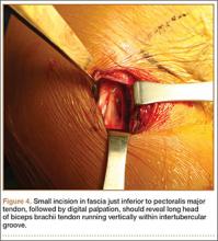 Biceps tenodesis should preserve the length–tension relationship of the biceps muscle and maintain its normal contour. Tenodesis location may be proximal or distal. Proximal fixation can be performed arthroscopically, and its advocates argue that keeping the LHB tendon within the bicipital groove preserves muscle strength. Boileau and Neyton11 found biceps strength to be 90% that of the contralateral arm after arthroscopic tenodesis. The bicipital groove, however, is lined with synovium and is a primary site of LHB pathology. Up to 78% of intra-articular biceps tears extend through the groove outside the joint.12 Proximal tenodesis thus retains a major pain generator. In a retrospective study of 188 patients, Sanders and colleagues13,14 found a 36% revision rate after proximal arthroscopic tenodesis and a 13% rate after proximal open tenodesis with an intact biceps sheath—significantly lower than the 3% after distal tenodesis outside the bicipital groove.1 For this reason, we advocate distal biceps tenodesis beneath the pectoralis major tendon. After tenotomy with an arthroscopic basket (Figure 3), the LHB tendon is retracted out of the glenohumeral joint by extending the elbow. For the mini-open incision, the head of the bed is lowered from the beach-chair position to 30°. The arm is abducted on a Mayo stand, and the inferior border of the pectoralis major tendon is palpated. A 3-cm vertical incision is made along the medial arm starting 1 cm superior to the inferior pectoralis edge. The subcutaneous tissues are mobilized, and dissection is carried down to the pectoralis major and coracobrachialis tendons. Visualization of the cephalic vein indicates that the exposure is too far lateral. The horizontal fibers of the pectoralis major are identified, and a small incision through the inferior overlying fascia is directed laterally and then distally in line with the long axis of the humerus. Digital palpation helps identify the anterior humerus and fusiform LHB tendon running vertically within the intertubercular groove (Figure 4). Cephalad retraction of the pectoralis major allows direct visualization of the LHB tendon. A right-angle clamp is positioned deep to the LHB tendon and directed medial to lateral to retrieve the LHB tendon out of the incision.