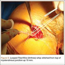 No. 2 looped Fiberwire (Arthrex) is then whip-stitched from the top of the myotendinous junction up 20 mm (Figure 5). The remaining 2 to 3 cm of LHB tendon proximal to the whip-stitching may be excised to remove inflammatory tissue. The pectoralis major is retracted superiorly with an Army-Navy retractor while a pointed Hohmann retractor is placed laterally. Medial retraction of the conjoined tendon should be done carefully with a Chandler elevator and minimal levering. In a cadaveric study, Dickens and colleagues15 found that the musculocutaneous nerve, radial nerve, and deep brachial artery were all within 1 cm of the standard medial retractor. Compared with internal rotation of the arm, external rotation moves the musculocutaneous nerve 11 mm farther from the tenodesis site.15