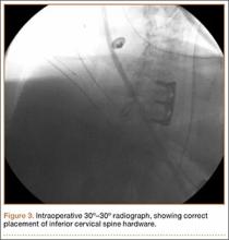 Invasive techniques to improve visualization have also been described. In 1 study, exposure had to be extended cephalad to allow for manual counting of cervical vertebrae when the mid- to lower cervical vertebrae had to be identified in a morbidly obese patient.5 More invasive spine procedures are associated with higher rates of complications, increased blood loss, more soft-tissue trauma, and longer hospital stays.6 We present a view 30º oblique from horizontal and 30º cephalad from neutral as a variation of the lateral radiograph that improves visualization of the mid- to lower cervical vertebrae. The authors have obtained the patients’ informed written consent for print and electronic publication of these case reports.