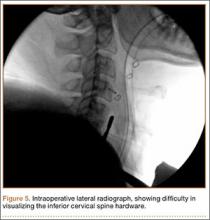 Two adequate views of the lower cervical vertebrae are necessary to confirm the 3-dimensional location of any hardware placed during cervical spine fusion. Visualizing the lower cervical vertebrae in 2 planes intraoperatively is often a challenge because the shoulders obstruct the lateral view.1 Techniques have been described to improve lateral visualization, including gentle traction of the arms via wrist restraints or taping the shoulders down inferiorly.2,3 These techniques have their inadequacies, including an association with peripheral nerve injury and brachial plexopathy.4 In patients with stout necks, these methods may still be insufficient to achieve adequate visualization of the lower cervical vertebrae.