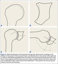The cartilage of the humeral head is thickest at its center, and thinnest at the periphery (Figure 3A).13,14 Conversely, the cartilage of the glenoid is thinnest at the fovea and thickest in the periphery (Figure 3B).14 It seems obvious that in order to maximally distribute high loads across this joint, the center of the humeral head should rest in the center of the glenoid. Interestingly, this does not occur during most positions of the shoulder. When upright, the center of the humeral head is directed above the glenoid in the coronal plane (Figure 3C). In order to align the glenohumeral joint optimally for the distribution of loads across the joint, the humerus must be abducted approximately 60° relative to the scapula. Assuming a 2:1 glenohumeral to scapulothoracic abduction for arm abduction relative to the thorax,15 this equates to approximately 90° of thoracohumeral abduction—the exact kinematic position of the shoulder during both critical moments of throwing (Figure 3D).