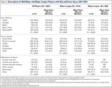Injury activity was based on the position being played at the time of injury, with categories of infield and outfield corresponding to fielding activities (defense), with batting and base runner categories corresponding to activities while on offense (Table 2). The occurrence of hip and groin injuries while players are fielding on defense (MiLB 33.0%, MLB 37.2%, all players 33.8%) was significantly greater compared to injuries while batting and base running on offense (MiLB 24.9%, MLB 21.7%, all players 24.3%) (all P values < .001). There was a high percentage of missing data for the event position variable, which resulted from this field not being available in HITS for 2011. Time lost due to hip and groin injuries was similar across leagues with respect to injury activity, ranging on average between 8 and 18 days.