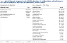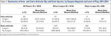 The 1823 hip and groin injuries across both leagues were further classified using the SMDCS descriptions as intra-articular (N = 84) or extra-articular (N = 1739) (Table 3). A much larger percentage of hip and groin injuries were extra-articular (MiLB 95.6%, MLB 94.4%, all players 95.4%) compared to those classified as intra-articular (Table 3). The most common extra-articular injuries were strains or contusions of the adductor, iliopsoas, or gluteal muscles, making up 79.1% of this group of injuries. The most common intra-articular injuries were FAI and a labral tear, accounting for 80.9% of these injuries. Only a small percentage of the extra-articular cases required surgery (MiLB 3.4%, MLB 5.8%, all players 3.8%) (Table 4). This finding was in contrast to the larger percentage of intra-articular cases requiring surgery (MiLB 40.3%, MLB 41.2%, all players 40.5%). Time lost varied greatly by surgery status, as well as extra-articular or intra-articular, as would be expected even after excluding season-ending injuries. For both types of injuries, the average time lost was consistently greater for injuries that required surgery versus the ones that did not result in surgery.