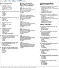 Data were stored using Microsoft Excel (Microsoft) and analyzed using SAS Software version 9.3 (SAS Institute, Inc.). Demographic survey responses were reported using descriptive statistics. Responses to clinical survey questions were reported using frequencies and percentages. To identify when a majority consensus was achieved for a given question, responses were flagged as reaching consensus when more than 50% of participants gave the same response.13In the event that only 2 response options were available, reaching consensus required 67% of respondents to choose a single answer (since, by default, a consensus would be reached with only 2 response options). Because this was an analysis of all respondents, an a priori power calculation was not performed. Associations between training and practice demographics and responses to clinical questions were investigated using chi-square analyses. All comparative analyses were two-tailed and used P = .05 as the threshold for statistical significance.