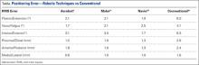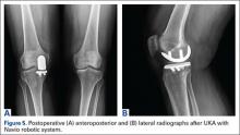 Compared to conventional UKA, robotic assistance has consistently demonstrated improved surgical accuracy, even through minimally invasive incisions (Figures 4, 5).6,20-28 Several studies have found substantial reduction in variability and error of component positioning with use of semiautonomous robotic tools.6,21,25 In fact, precision appears to be comparable regardless of whether an image-free system or one requiring a preoperative CT scan is used (Table). Further, in addition to improving component and limb alignment, Plate and colleagues22 demonstrated that RAS-based UKA systems can help the surgeon precisely reproduce plans for soft-tissue balancing. The authors reported ligament balancing to be accurate up to .53 mm compared to the preoperative plan, with approximately 83% of cases balanced within 1 mm of the plan through a full range of flexion.22