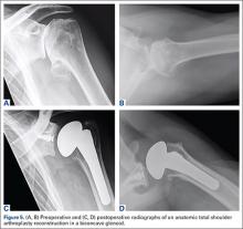 As with any TSA, the primary goals in treating patients with B2 glenoid defects are to provide the patient with a pain-free, stable, and functional shoulder (Figures 5A-5D). There are, however, a few challenges that are unique to TSA in the setting of B2 glenoid defects. Because the humeral head is often subluxated posteriorly into the defect, the anterior capsule and rotator cuff can tighten while the posterior aspect of the joint becomes lax. These soft tissues must be balanced during TSA in order to stabilize the shoulder and restore the appropriate length-tension relationship of the rotator cuff. The other primary concern is restoration of appropriate glenoid version and lateralization. To accomplish this, the most common techniques utilized are asymmetric reaming, bone graft augmentation, and glenoid component augmentation.27,28