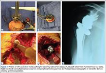 For most defects, the resected humeral head provides the ideal source of graft. After initial reaming of the anterior glenoid, the defect must be sized and measured. We then recommend using a guided, cannulated system to place a central pin, lying perpendicular to the glenoid axis in neutral position. The anterior glenoid is then reamed enough to create a flat surface on which to attach the bone graft. The posterior surface is then gently burred to create a bleeding surface to enhance graft incorporation. The graft is then contoured to the defect and placed flush with the anterior glenoid. Cannulated screws are placed over guidewires to fix the graft. Using an arthroscopic cannula inserted posteriorly allows for easier placement of the guidewires and easier implantation of the screws. Although a reamer or burr can be used to contour the graft once it is fixed in place, this should be minimized to prevent loss of fixation. When the graft is fixed, we then cement the glenoid component into place.