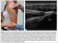 The glenohumeral joint is best viewed posteriorly, limiting how much of the intra-articular portion of the joint can be imaged. The arm remains in a neutral position; palpate for the posterior acromion and place the probe just inferior to it, wedging up against it (Figure 3A). The glenohumeral joint will be seen by keeping the probe parallel to the ground (Figure 3B). The MRI equivalent is the axial plane. If a joint effusion exists, it can be seen in the posterior recess.15 A hyperechoic triangular region in between the humeral head and the glenoid will represent the glenoid labrum (Figure 3B). By internally and externally rotating the arm, the joint and labrum complex can be dynamically examined. From the labrum, scanning superior and medial can sometimes show the spinoglenoid notch where a paralabral cyst might be seen.15
