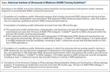 The AIUM certification is a voluntary peer reviewed process that acknowledges that a practice is meeting national standards and aids in improving their respective MSK ultrasound protocols. They also provide guidelines on demonstrating training and competence on performing and/or interpreting diagnostic MSK examinations (Table).10 The ARDMS certification provides an actual individual certification referred to as “Registered” in MSK ultrasound.11 The physician must perform 150 diagnostic MSK ultrasound evaluations within 36 months of applying and pass a 200-question examination that is offered twice per year.11 None of these certifications are mandated by the American Medical Association (AMA) or American Osteopathic Association (AOA).