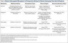 Chronic anticoagulation is a common preexisting condition in patients undergoing total joint arthroplasty (TJA). Atrial fibrillation (AF), the most common underlying disorder requiring chronic anticoagulation, affects more than 3 million patients in the United States—a number that is projected to increase to 16 million by 2050.1,2 Other common indications for anticoagulation are deep vein thrombosis (DVT) treatment, presence of a prosthetic heart valve, and venous thromboembolism (VTE) prevention after hip or knee arthroplasty. These patients face the additional risks of hemorrhage, persistent wound drainage, hematoma formation, transfusion requirements, periprosthetic joint infection, and longer hospital stay.1 Chronic anticoagulation traditionally has been managed with warfarin, which inhibits production of the vitamin K–dependent clotting factors II, VII, IX, and X. However, the new novel oral anticoagulants (NOACs), which target individual factors in the clotting cascade, are gaining favor as chronic anticoagulant agents because of their ease of use and improved efficacy and safety. These agents include the factor IIA inhibitor dabigatran (Pradaxa) and the direct factor Xa inhibitors rivaroxaban (Xarelto) and apixaban (Eliquis).