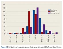 The LA axis of the femur did not correspond exactly to the AP axis at all femoral levels. At the distal femur, mean (SD) lateral offset of the LA axis was 5.5° (7.5°) on the left and 8.3° (8.9°) on the right. At the midshaft, mean (SD) medial offset of the LA axis was 3.1° (8.4°) on the left and 1.2° (7.9°) on the right. At the proximal femur, mean (SD) lateral offset of the LA axis was 5.4° (9.2°) on the left and 6.2° (8.3°) on the right. The side-to-side differences were statistically significant for the distal femur and midshaft but not the proximal femur. Table 2 lists the 95% confidence intervals for the mean values. As the range of differences was small (0.7°-2.8°), and the differences may not be clinically detected on gross inspection during surgery, we pooled both sides’ values to arrive at a single mean for each level. The LA axis was offset a mean (SD) of 6.9° (8.3°) laterally at the distal femur, 2.2° (8.2°) medially at the midshaft, and 5.8° (8.6°) laterally at the proximal femur. Figure 5 shows the frequency of distribution of LA axis offset.Offset of the LA axis from the AP axis of the femur was significantly (P < .001) different for each femoral level, even when a multivariate analysis was performed to determine the effect of sex, age, or side. Age and sex had no significant effect on mean offset of LA axis from AP axis.