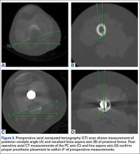 In total hip arthroplasty, the goal is to restore femoral anteversion, usually referenced to the remaining femoral neck segment.3 In total knee arthroplasty (TKA), proper rotation preserves normal patellofemoral tracking.5 Various landmarks are used, such as the PCs or the epicondyles. After tumor resections, these landmarks are often lost.6 However, there are no reports of studies validating a particular method of achieving proper rotational orientation of tumor endoprostheses, though several methods are being used. One method involves inserting 2 drill bits before osteotomy—one proximal to the intended level of resection on the anterior femur, and the other on the anterior tibial shaft. The straight line formed can establish a plane of rotation (and length), which the surgeon must aim to restore when the components are placed. This method is useful for distal femur resections but not proximal femur resections. Another method, based on the LA’s anatomical position on the posterior aspect of the femur,4 uses the prominence of the LA to align the prosthesis. With this method, the LA is assumed to be directly posterior (6 o’clock) on the femur. However, this assumption has not been confirmed by any study. A third method, described by Heck and Carnesale,5 involves marking the anterior aspect of the femur after resection and aligning the components to it. The authors cautioned against using the LA as a landmark, saying that its course is highly variable.