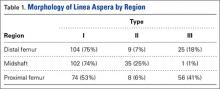 The LA is a narrow, elevated length of bone, with medial and lateral lips, that serves as an attachment site for muscles in the posterior thigh. Proximally, the LA presents with lateral, medial, and intermediate lips. In the midshaft, it is often elevated by an underlying bony ridge or pilaster complex. Distally, it diverges into 2 ridges that form the triangular popliteal surface.1,7 For the LA to be a reliable landmark, first it must be clearly identifiable on viewing a femoral cross-section. The LA that presents with type I or II morphology is distinctly identifiable, and an axis from its apex and bisecting the canal can easily be constructed. In our study, the LA presented with type I or II morphology in 82% of distal femoral sections and 99% of midshaft femoral sections. Therefore, the LA is a conspicuous landmark at these levels. In the proximal femur, 59% had type I or II morphology. Type III morphology could be identified on cross-sections by the persisting prominence of the lateral lip. However, it may be difficult to appreciate the LA with this morphology at surgery.