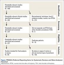 A total of 456 studies were located, and, after implementation of the exclusion criteria, 65 studies from 2005-2015 were included in the final analysis (Figure). Subjects of interest in this systematic review underwent a RTSA. Studies were not excluded based on the surgical indications (rotator cuff tear arthropathy, proximal humerus fractures, osteoarthritis) and there was no minimum follow-up or rehabilitation requirement. Study and subject demographic parameters analyzed included year of publication, journal of publication, country and continent of publication, years of subject enrollment, presence of study financial conflict of interest, number of subjects and shoulders, gender, age, the manufacturer and type of prosthesis used, and the degree of the humeral inclination (135° vs 155° humeral cup). Preoperative ROM, including forward elevation, abduction, external rotation with the arm adducted, and external rotation with the arm at 90° of abduction, were recorded. The same ROM measurements were recorded for the final follow-up visit that was reported. Internal rotation was recorded, but because of the variability with how this measurement was reported, it was not analyzed. Clinical outcome scores and complications were not assessed. Study methodological quality was evaluated using the Modified Coleman Methodology Score (MCMS).18