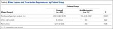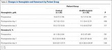Although there was no statistically significant difference in POD-1 or POD-2 Hb levels between the antifibrinolytic and control groups, the antifibrinolytic group trended higher on POD-1 (11.1 g vs 10.7 g; P = .108) and POD-2 (11.5 g vs 10.2 g; P = .117) (Table 3). Mean Hb level was 8.1 g for control patients transfused on POD-1 and 7.9 g for control patients transfused on POD-2. For control patients who were not transfused, mean Hb level was 10.7 g on POD-1 and 10.2 g on POD-2.
