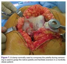 Patellar eversion can be difficult in a markedly obese or ankylosed knee, especially when the patella is difficult to grasp. This is facilitated by the use of a standard patellar clamp that is normally used to compress the patella during component cementation (Figure 1).3