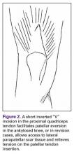 A tibial tubercle osteotomy is often recommended in the ankylosed knee but can be avoided by making a short inverted “V” incision in the proximal quadriceps tendon (Figure 2).4