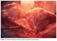 This maneuver, along with a smooth 1/8-inchpin in the tibial tubercle, also protects the patellar tendon from avulsing (Figure 3). The patella can be easily everted and access to the lateral parapatellar scar tissue allows a lateral release to be performed from inside out to further mobilize the knee and enhance exposure. The inverted “V” incision can be closed anatomically, and no modifications of the postoperative physical therapy program are necessary.Protecting the Soft Tissues During Surgery